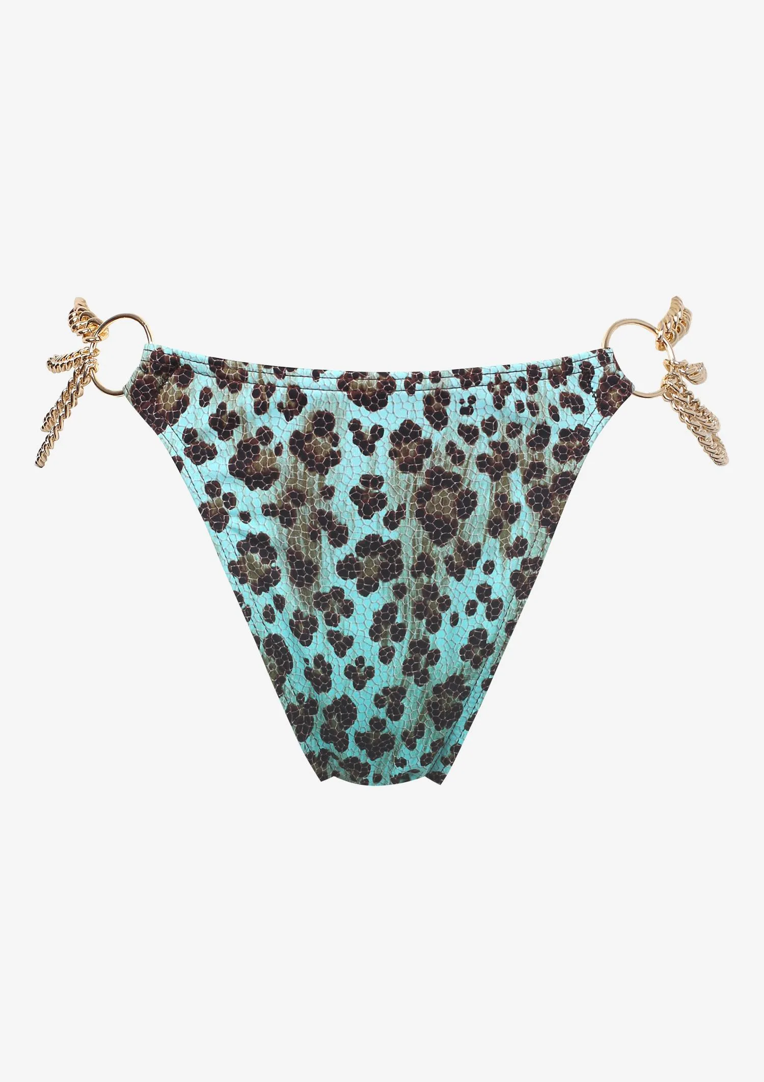 Klasyczne majtki w drapieżny wzór. Po bokach złote łańcuchy.