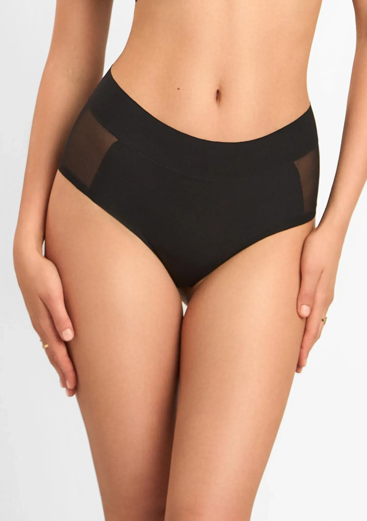 Wysokie figi z cienkiej, elastycznej dzianiny nie odznaczają się pod ubraniem. Szeroka gumka w talii stabilnie trzyma fason, nie roluje się. Po bokach wszyte panele z transparentnego tiulu przełamują jednolitą czerń, optycznie wysmuklają biodra i dodają lekkości. To model, który sprawdza się na co dzień, także pod dopasowane stylizacje.