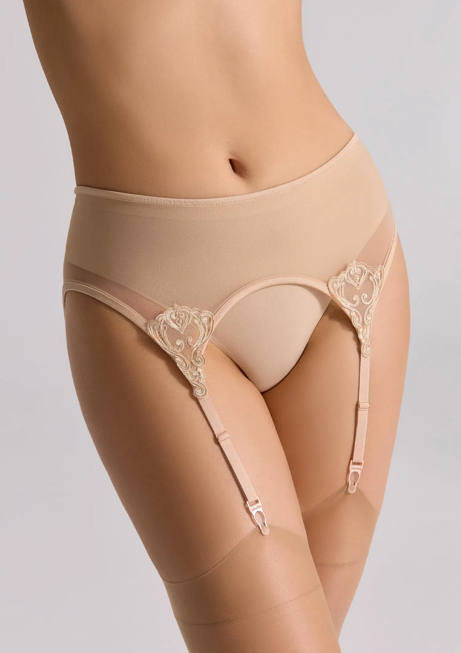 Pas do pończoch Michelle to lekka i zmysłowa propozycja wykonana z cielistego, elastycznego tiulu. Jego ozdobą są misterne haftowane aplikacje, które delikatnie przechodzą na ramiączka i subtelnie połyskują dzięki drobnym krysztłką. Z tyłu pasek posiada podwójne zapięcie z regulacją, co ułatwia dopasowanie do obwodu bioder. Neutralny, cielisty kolor pozwala łączyć go z różnorodną bielizną, a elementy w odcieniu różowego złota nadają całości wyjątkowego charakteru. Doskonale komponuje się z cielistymi pończochami, tworząc spójny i zmysłowy komplet.
