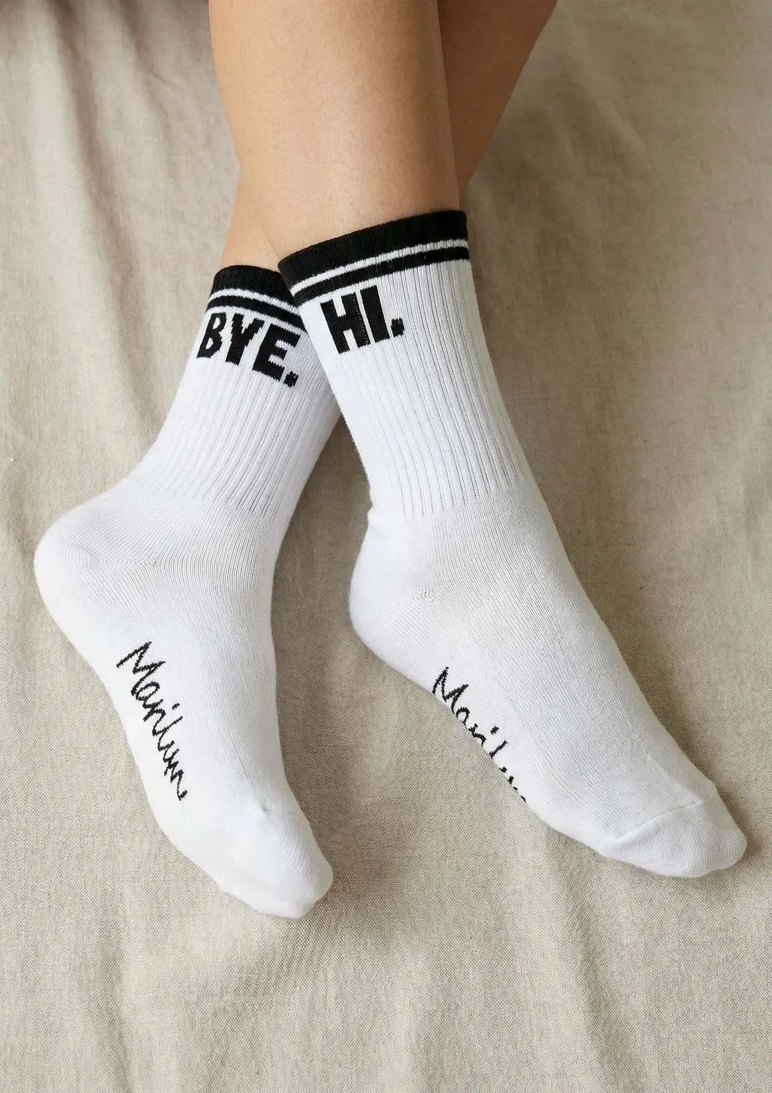 Skarpetki z kontrastowym napisem HI. / BYE. to wyrazisty, a jednocześnie minimalistyczny akcent stylizacyjny inspirowany estetyką streetwearu. Graficzny detal umieszczony w górnej części skarpet przyciąga uwagę i nadaje całości nowoczesny, lekko ironiczny charakter. Klasyczna biała baza została przełamana czarnymi elementami oraz sportowym ściągaczem z paskami, co podkreśla uniwersalny, miejski styl modelu. Średnia długość sprawia, że skarpetki dobrze komponują się zarówno ze sneakersami, jak i codziennym obuwiem. Miękka, elastyczna dzianina dopasowuje się do stopy i utrzymuje skarpetki na miejscu przez cały dzień, zapewniając komfort noszenia.