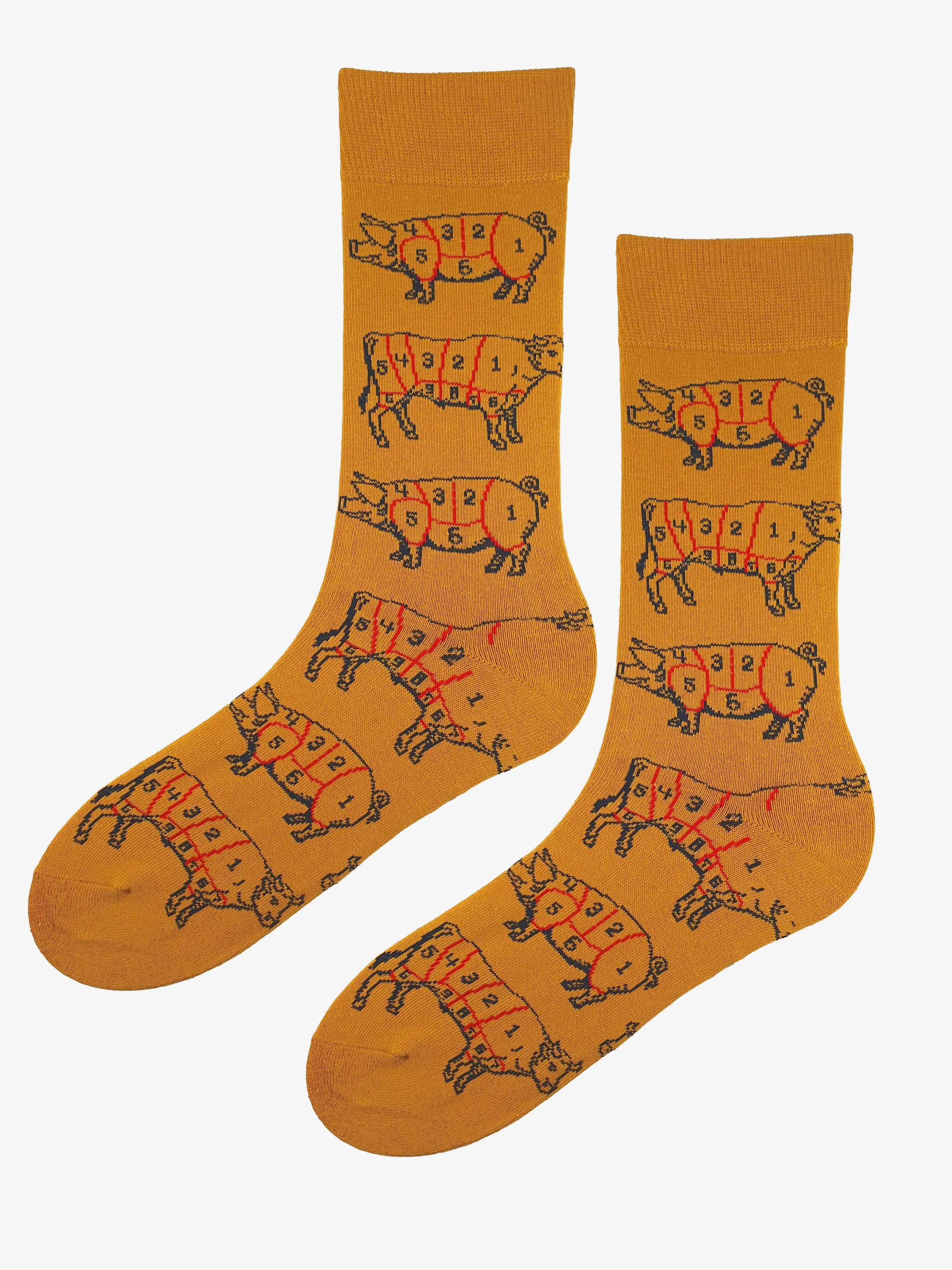Męskie skarpetki w soczystym odcieniu musztardowej żółci, ozdobione charakterystycznym wzorem przedstawiającym schemat podziału mięsa na sylwetce świni. Powtarzający się motyw tworzy humorystyczny, wyrazisty akcent, który przyciąga uwagę i idealnie wpasowuje się w luźne, codzienne stylizacje. Model wykonany jest z miękkiej, elastycznej dzianiny, która dobrze dopasowuje się do stopy, zapewniając komfort noszenia przez cały dzień. Idealne jako oryginalny prezent lub dodatek dla miłośników nietuzinkowych wzorów.