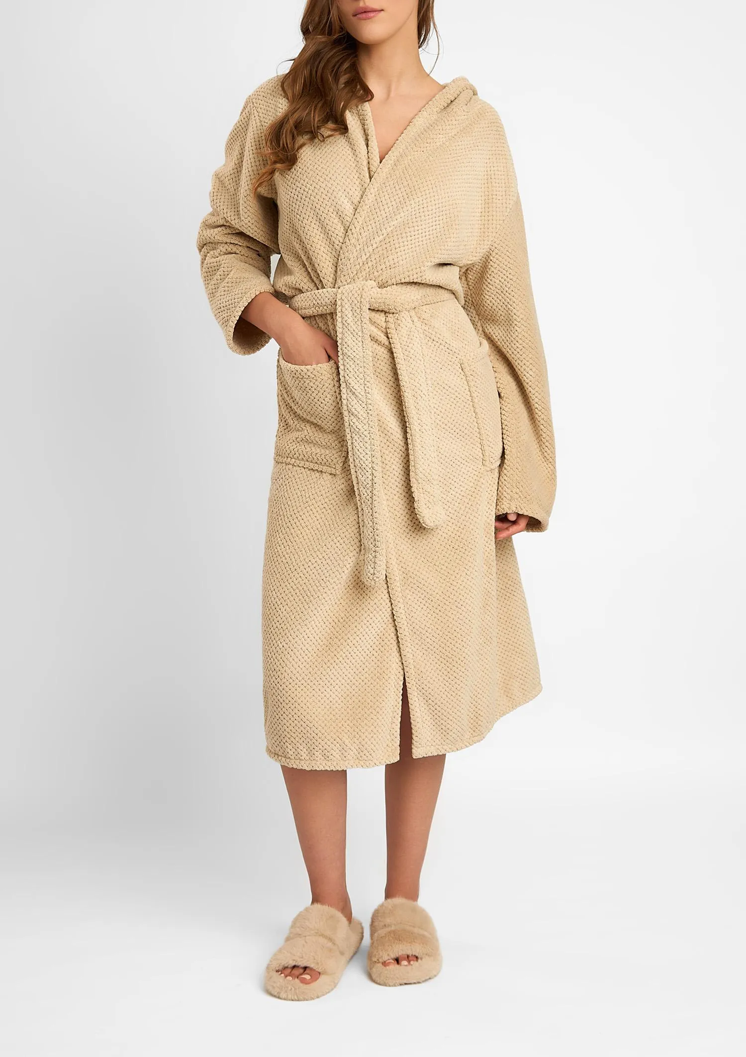 Szlafrok Comfort to idealne połączenie miękkości i praktycznego designu, które sprawia, że codzienny relaks nabiera wyjątkowego charakteru. Uszyty z puszystej dzianiny o delikatnej strukturze, otula ciało przyjemnym ciepłem, tworząc poczucie pełnego komfortu. Kaptur dodaje całości przytulności, a jednocześnie chroni przed zimnem w chłodniejsze poranki i wieczory. Wiązanie w talii pozwala dopasować fason do sylwetki i podkreśla jej naturalne linie, a praktyczne kieszenie nadają projektowi funkcjonalny charakter. Długość do kolan sprawia, że szlafrok jest wygodny i uniwersalny – doskonały zarówno po kąpieli, jak i podczas domowego wypoczynku.