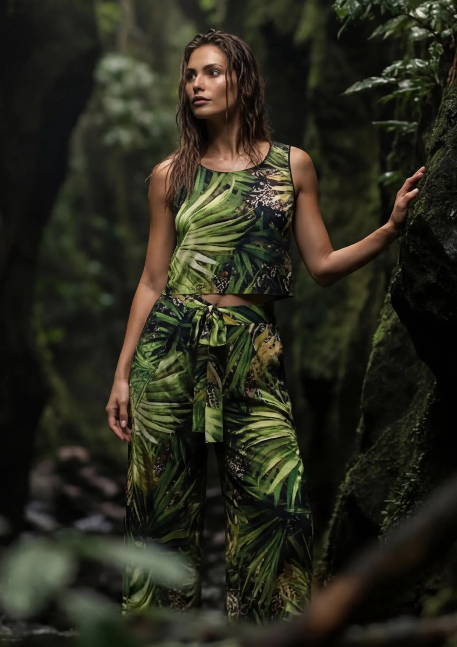 Top Tropical wykonany jest z lekkiej, oddychającej mikrofibry o przyjemnym, jedwabistym chwycie. Tropikalny motyw liści w nasyconej zieleni nadaje mu wyrazisty, wakacyjny charakter. Model na szerokich ramiączkach został lekko rozszerzony ku dołowi, co podkreśla modny fason oversize i zapewnia swobodę noszenia. Zaszewki piersiowe modelują biust i poprawiają dopasowanie topu do sylwetki. Prosta, minimalistyczna konstrukcja sprawia, że top jest niezwykle uniwersalny - doskonały zarówno solo, jak i w komplecie ze spodniami z tej samej kolekcji. Materiał jest odporny na gniecenie, dlatego świetnie sprawdzi się w podróży i podczas wakacyjnych wyjazdów.